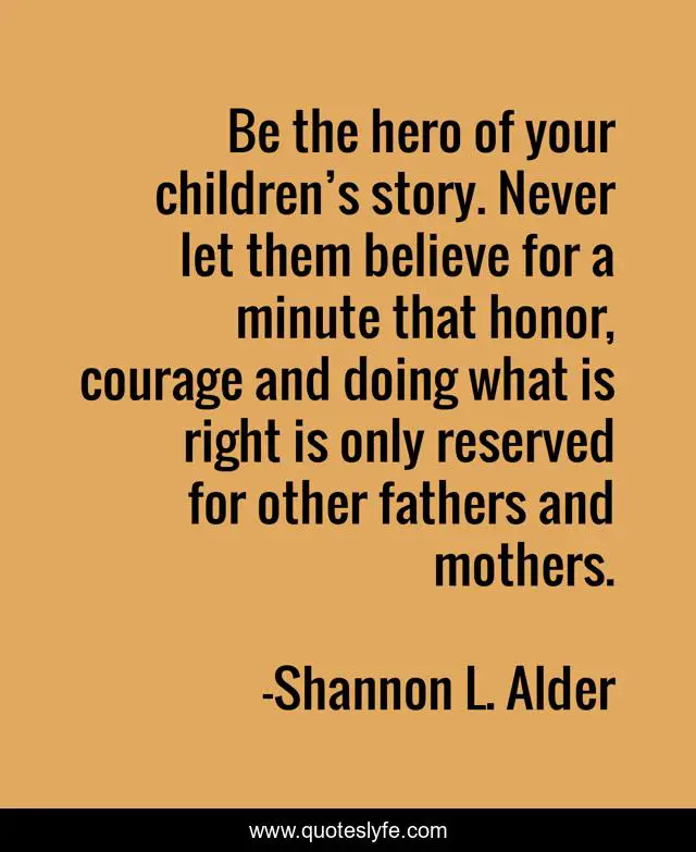 This page presents the quote "Be the hero of your children’s story. Never let them believe for a minute that honor, courage and doing what is right is only reserved for other fathers and mothers.". Author of this quote is Shannon L. Alder. This quote is about duty, warrior, love, children-s-books, guardian-angels, children, honor, stripling-warriors, courage,.