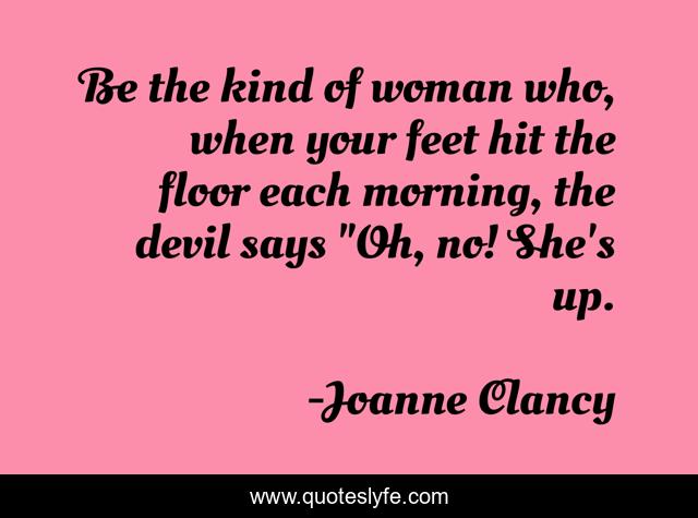 This page presents the quote "Be the kind of woman who, when your feet hit the floor each morning, the devil says "Oh, no! She's up.". Author of this quote is Joanne Clancy. This quote is about enthusiasm, life, funny-and-random, inspirational, women,.