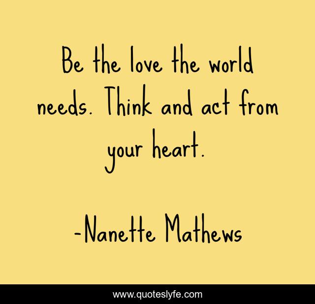 This page presents the quote "Be the love the world needs. Think and act from your heart.". Author of this quote is Nanette Mathews. This quote is about caring, compassion, show-love,.