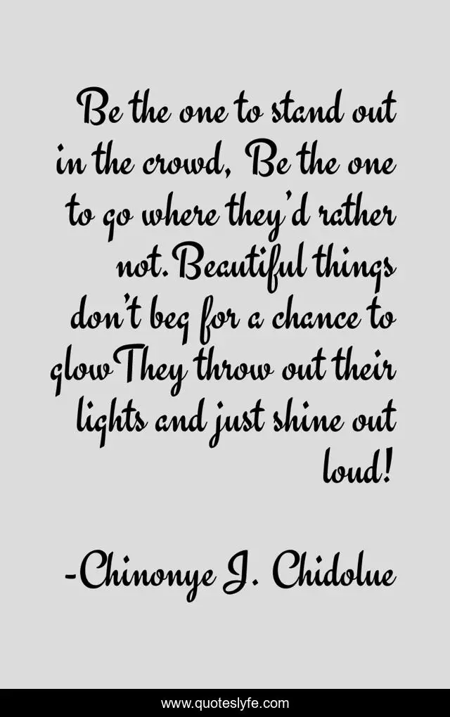"Chinonye J. Chidolue Quotes." Quoteslyfe.com, 2025. Sat. 06 Dec. 2025. <https://www.quoteslyfe.com/quote/Be-the-one-to-stand-out-in-83249>.
