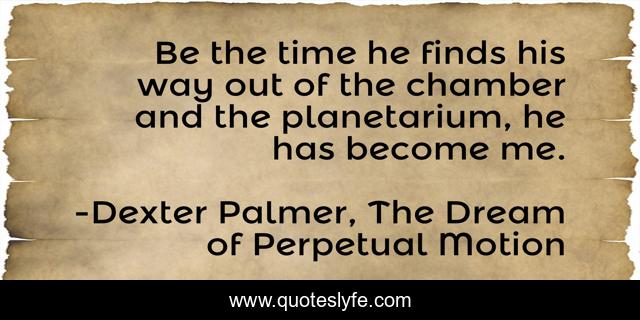 This page presents the quote "Be the time he finds his way out of the chamber and the planetarium, he has become me.". Author of this quote is Dexter Palmer, The Dream of Perpetual Motion. This quote is about narrator, the-dream-of-perpetual-motion, dexter-palmer, coming-of-age, life-changing, transformation, change,.