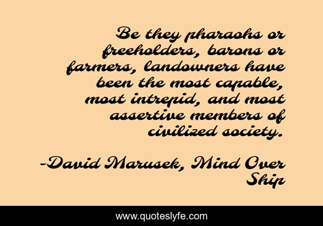 This page presents the quote "Be they pharaohs or freeholders, barons or farmers, landowners have been the most capable, most intrepid, and most assertive members of civilized society.". Author of this quote is David Marusek, Mind Over Ship. This quote is about dystopia, landowners, economics,.