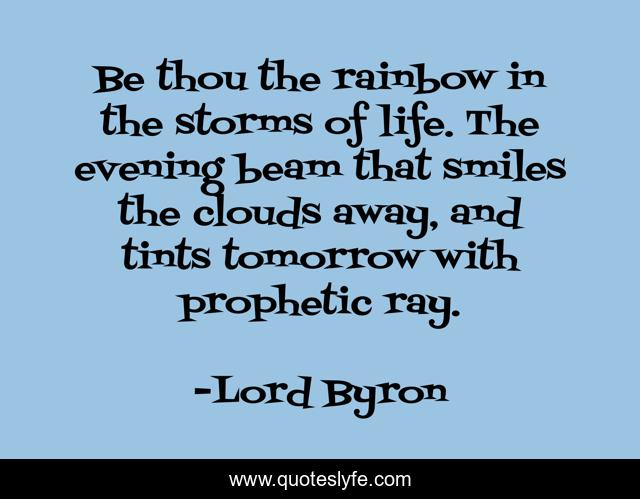 This page presents the quote "Be thou the rainbow in the storms of life. The evening beam that smiles the clouds away, and tints tomorrow with prophetic ray.". Author of this quote is Lord Byron. This quote is about smile, clouds, happiness, rainbow,.