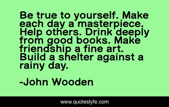 This page presents the quote "Be true to yourself. Make each day a masterpiece. Help others. Drink deeply from good books. Make friendship a fine art. Build a shelter against a rainy day.". Author of this quote is John Wooden. This quote is about friendship, art, help others,.