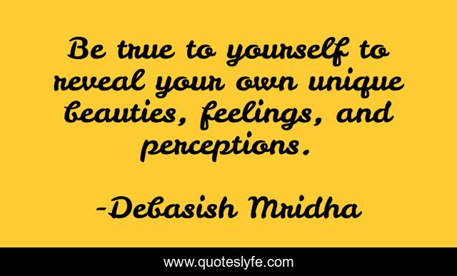 This page presents the quote "Be true to yourself to reveal your own unique beauties, feelings, and perceptions.". Author of this quote is Debasish Mridha. This quote is about perceptions, beauties, be-true-to-yourself, debasish-mridha, feelings, quotes, inspirational, enthusiasm, debasish-mridha-m-d,.