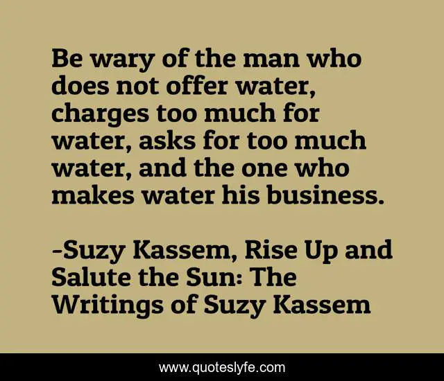 This page presents the quote "Be wary of the man who does not offer water, charges too much for water, asks for too much water, and the one who makes water his business.". Author of this quote is Suzy Kassem, Rise Up and Salute the Sun: The Writings of Suzy Kassem. This quote is about water, charges-for-water, suzy-kassem, business,.