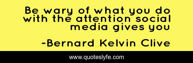 This page presents the quote "Be wary of what you do with the attention social media gives you". Author of this quote is Bernard Kelvin Clive. This quote is about social-media-advice, branding, social-media, reputation-management, personal-branding,.