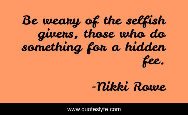 This page presents the quote "Be weary of the selfish givers, those who do something for a hidden fee.". Author of this quote is Nikki Rowe. This quote is about wise-words, strength, quote, wild-and-free, wisdom, truth, self-discovery, inner-strength, inner-being,.