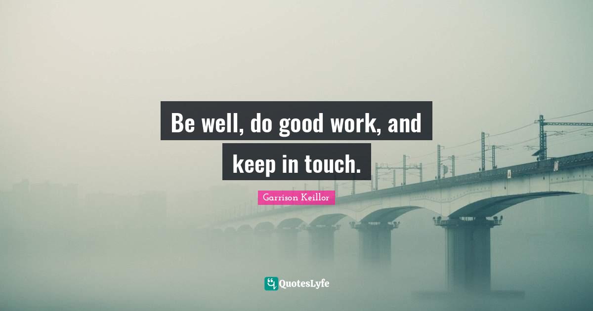 This page presents the quote "Be well, do good work, and keep in touch.". Author of this quote is Garrison Keillor. This quote is about love, goodbye, good work, farewell,.