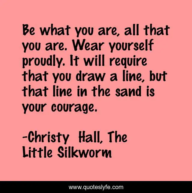 This page presents the quote "Be what you are, all that you are. Wear yourself proudly. It will require that you draw a line, but that line in the sand is your courage.". Author of this quote is Christy Hall, The Little Silkworm. This quote is about enthusiasm, writers, inspirational, life-lessons,.