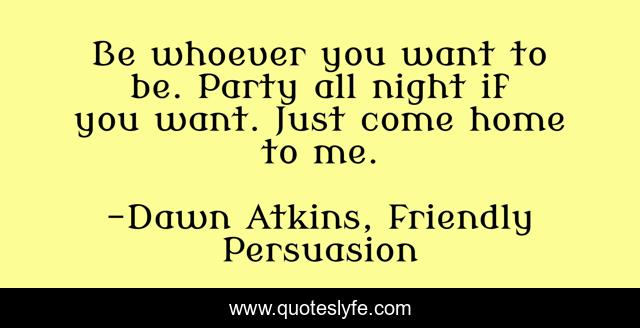 This page presents the quote "Be whoever you want to be. Party all night if you want. Just come home to me.". Author of this quote is Dawn Atkins, Friendly Persuasion. This quote is about acceptance, love, affection,.