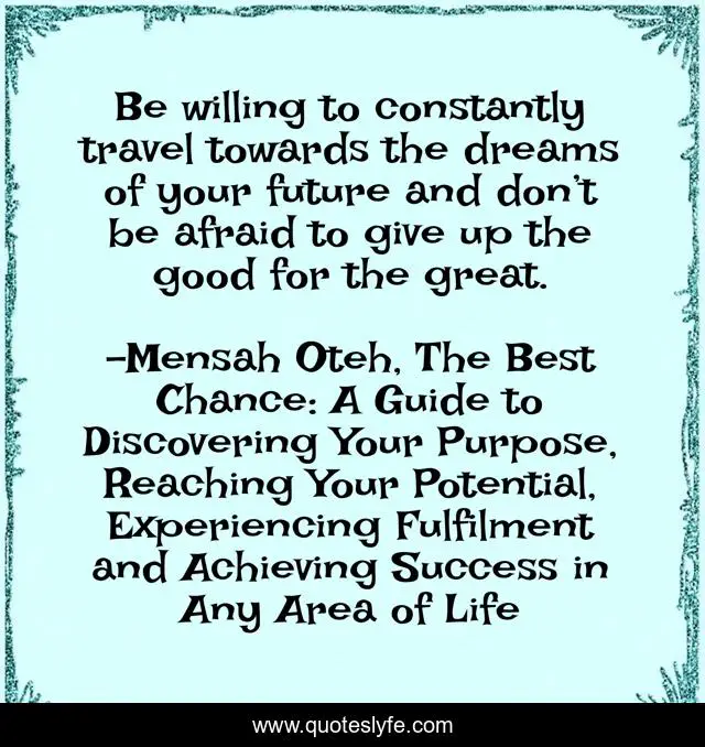 "Mensah Oteh, The Best Chance: A Guide to Discovering Your Purpose, Reaching Your Potential, Experiencing Fulfilment and Achieving Success in Any Area of Life Quotes." Quoteslyfe.com, 2025. Sat. 06 Dec. 2025. <https://www.quoteslyfe.com/quote/Be-willing-to-constantly-travel-towards-the-15890>.