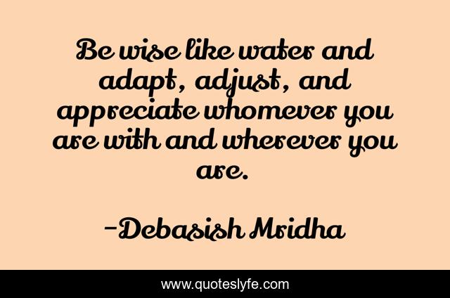 This page presents the quote "Be wise like water and adapt, adjust, and appreciate whomever you are with and wherever you are.". Author of this quote is Debasish Mridha. This quote is about appreciate-the-now, life-lesson, appreciate, philosophy, debasish-mridha, wisdom, quotes, adjust, adapt,.
