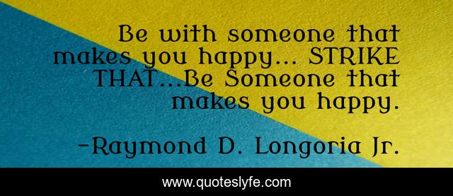 This page presents the quote "Be with someone that makes you happy... STRIKE THAT...Be Someone that makes you happy.". Author of this quote is Raymond D. Longoria Jr.. This quote is about inspiring, kindness, belief, compassion, spiritual, meaning, prayer, trust, forgiveness,.