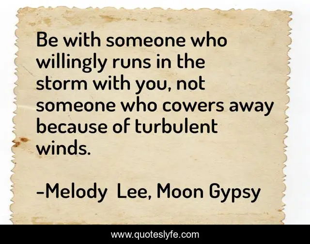 This page presents the quote "Be with someone who willingly runs in the storm with you, not someone who cowers away because of turbulent winds.". Author of this quote is Melody Lee, Moon Gypsy. This quote is about relationships, love, relationship, poetry, wisdom, affection,.