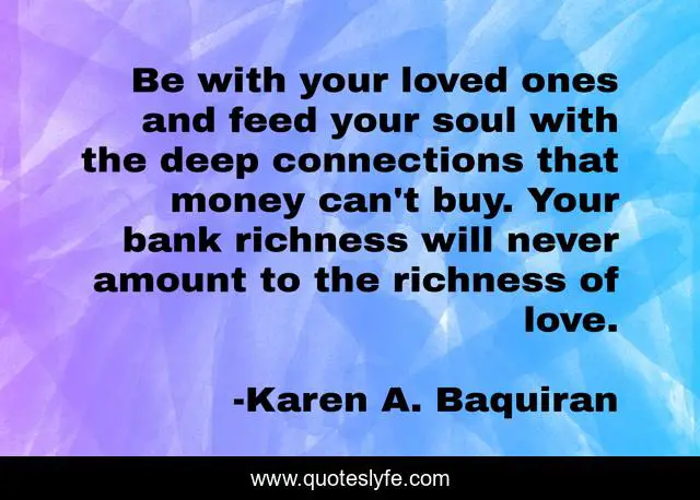 This page presents the quote "Be with your loved ones and feed your soul with the deep connections that money can't buy. Your bank richness will never amount to the richness of love.". Author of this quote is Karen A. Baquiran. This quote is about loveyourself, love, soulconnections, light, peace, loveyourselfmovement, affection,.