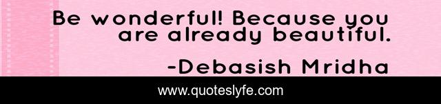 This page presents the quote "Be wonderful! Because you are already beautiful.". Author of this quote is Debasish Mridha. This quote is about beautiful, life, love, knowledge, inspirational, intelligence, philosophy, wisdom, wonderful,.