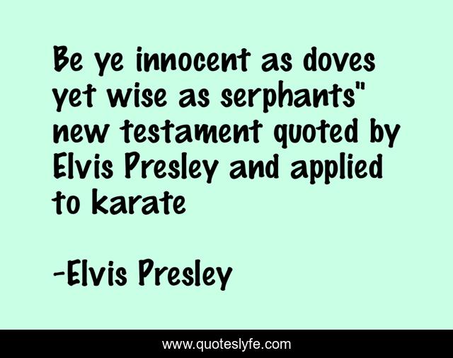 This page presents the quote "Be ye innocent as doves yet wise as serphants" new testament quoted by Elvis Presley and applied to karate". Author of this quote is Elvis Presley. This quote is about karate, elvis, bible,.