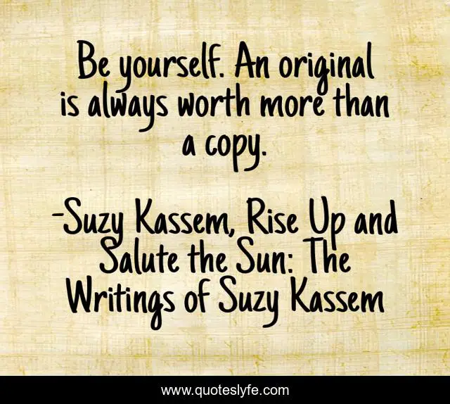 "Suzy Kassem, Rise Up and Salute the Sun: The Writings of Suzy Kassem Quotes." Quoteslyfe.com, 2025. Sun. 07 Dec. 2025. <https://www.quoteslyfe.com/quote/Be-yourself-An-original-is-always-worth-147622>.