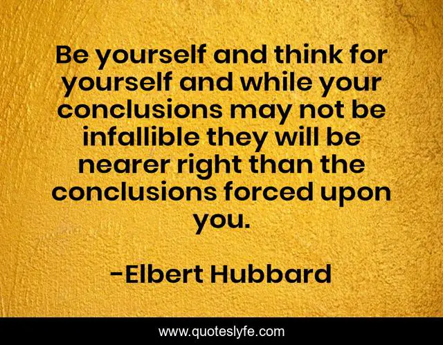 This page presents the quote "Be yourself and think for yourself and while your conclusions may not be infallible they will be nearer right than the conclusions forced upon you.". Author of this quote is Elbert Hubbard. This quote is about self, reliance,.