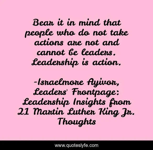 This page presents the quote "Bear it in mind that people who do not take actions are not and cannot be leaders. Leadership is action.". Author of this quote is Israelmore Ayivor, Leaders' Frontpage: Leadership Insights from 21 Martin Luther King Jr. Thoughts. This quote is about food-for-thought, martin-luther, leaders, hard-work, people, leadership-is-action, work, actions, martin-luther-king,.