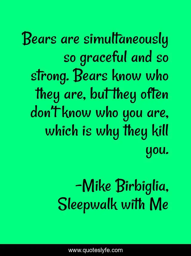 This page presents the quote "Bears are simultaneously so graceful and so strong. Bears know who they are, but they often don’t know who you are, which is why they kill you.". Author of this quote is Mike Birbiglia, Sleepwalk with Me. .