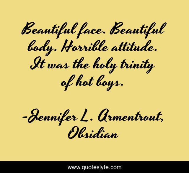 This page presents the quote "Beautiful face. Beautiful body. Horrible attitude. It was the holy trinity of hot boys.". Author of this quote is Jennifer L. Armentrout, Obsidian. This quote is about boys, hot, humor,.