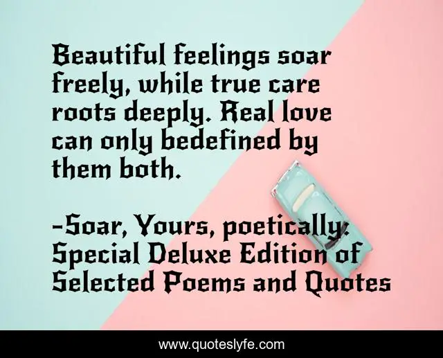 This page presents the quote "Beautiful feelings soar freely, while true care roots deeply. Real love can only bedefined by them both.". Author of this quote is Soar, Yours, poetically: Special Deluxe Edition of Selected Poems and Quotes. This quote is about life, love, people, poetry, passion, roots, affection, care,.