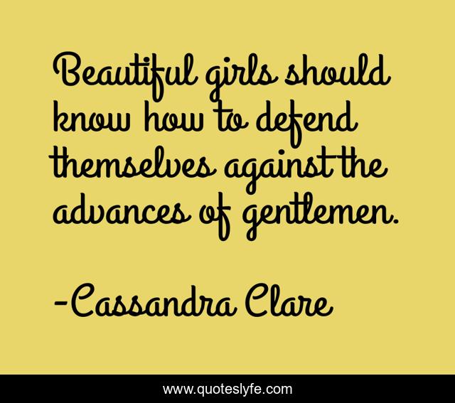 This page presents the quote "Beautiful girls should know how to defend themselves against the advances of gentlemen.". Author of this quote is Cassandra Clare. This quote is about girls, self-defense, beauty,.