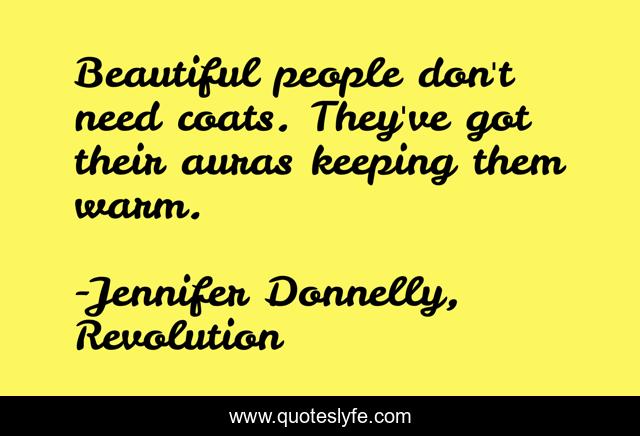 This page presents the quote "Beautiful people don't need coats. They've got their auras keeping them warm.". Author of this quote is Jennifer Donnelly, Revolution. This quote is about fashion, revolution, auras, coats, warm, jennifer-donnelly, beautiful-people,.