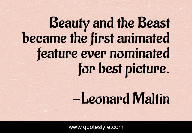 This page presents the quote "Beauty and the Beast became the first animated feature ever nominated for best picture.". Author of this quote is Leonard Maltin. This quote is about picture, best, first,.