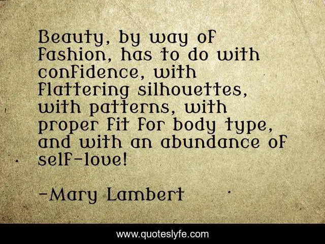 This page presents the quote "Beauty, by way of fashion, has to do with confidence, with flattering silhouettes, with patterns, with proper fit for body type, and with an abundance of self-love!". Author of this quote is Mary Lambert. This quote is about confidence, self-love,.