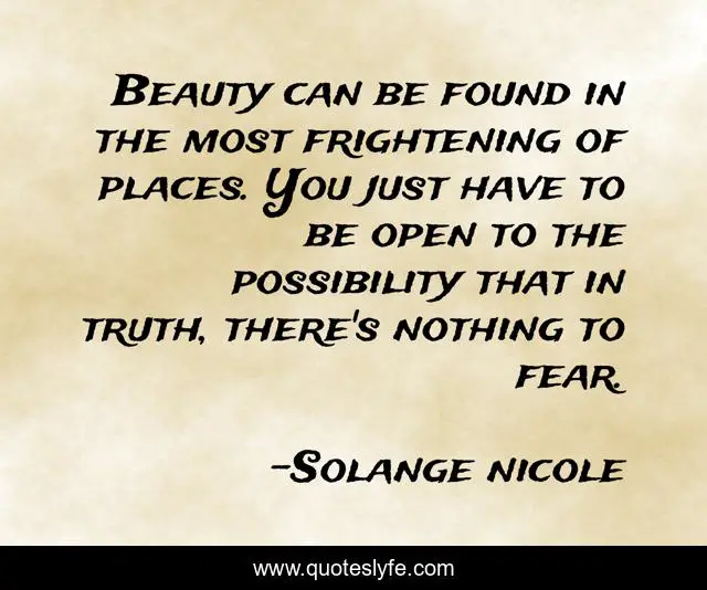 This page presents the quote "Beauty can be found in the most frightening of places. You just have to be open to the possibility that in truth, there's nothing to fear.". Author of this quote is Solange nicole. This quote is about life, love, darkness, nature, fearless, metaphysical, spiritual, inspirational, enthusiasm,.
