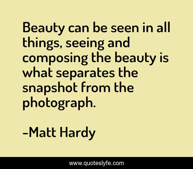This page presents the quote "Beauty can be seen in all things, seeing and composing the beauty is what separates the snapshot from the photograph.". Author of this quote is Matt Hardy. This quote is about photography, composition,.