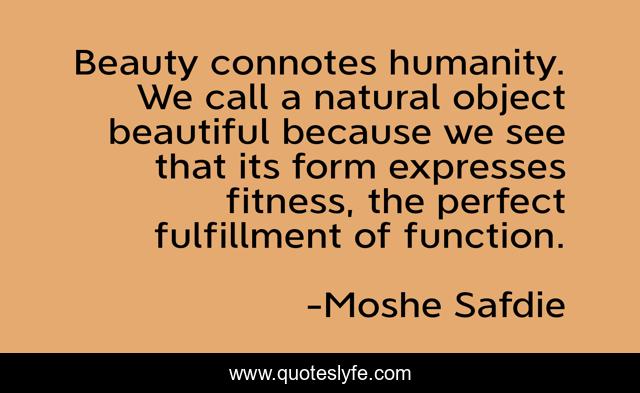 This page presents the quote "Beauty connotes humanity. We call a natural object beautiful because we see that its form expresses fitness, the perfect fulfillment of function.". Author of this quote is Moshe Safdie. This quote is about beautiful, humanity, beauty,.