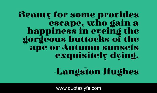 This page presents the quote "Beauty for some provides escape, who gain a happiness in eyeing the gorgeous buttocks of the ape or Autumn sunsets exquisitely dying.". Author of this quote is Langston Hughes. This quote is about autumn, happiness, beauty,.