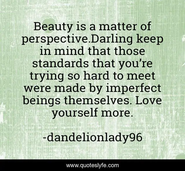 This page presents the quote "Beauty is a matter of perspective.Darling keep in mind that those standards that you’re trying so hard to meet were made by imperfect beings themselves. Love yourself more.". Author of this quote is dandelionlady96. This quote is about positive-thoughts, self-love, self-respect, positive-thinking,.