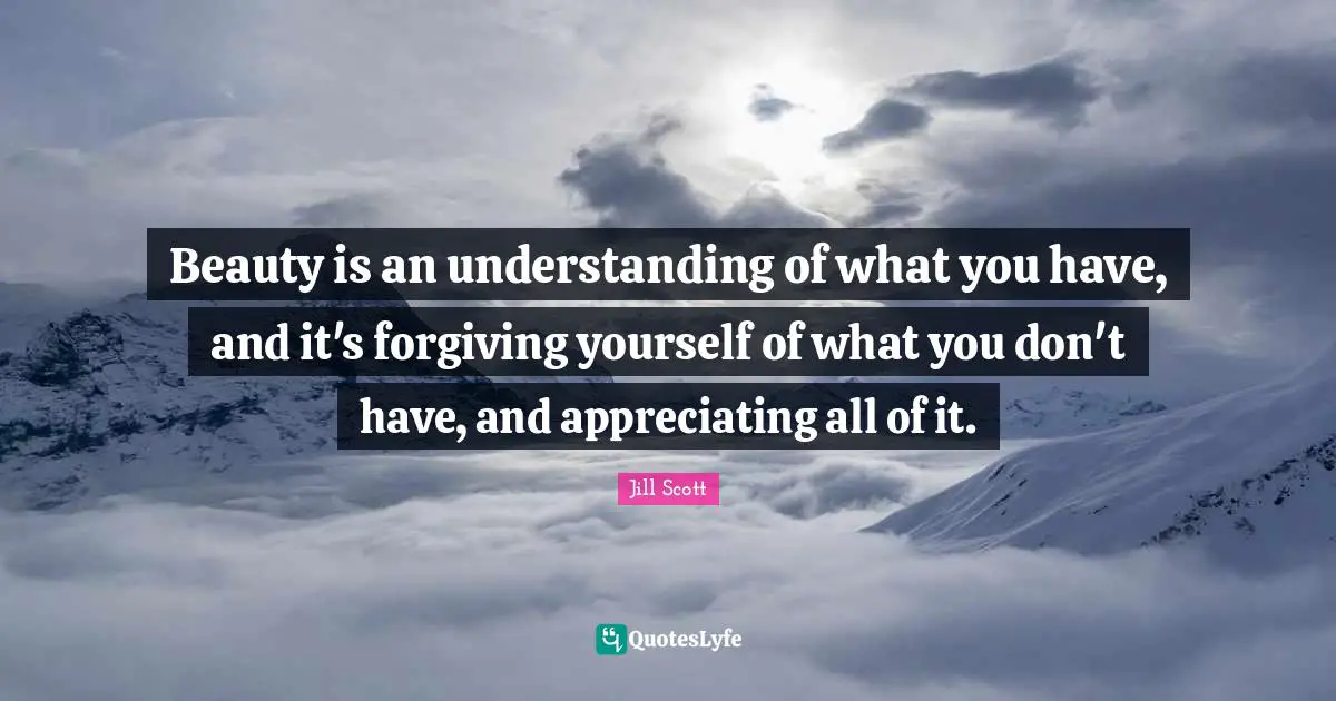 This page presents the quote "Beauty is an understanding of what you have, and it's forgiving yourself of what you don't have, and appreciating all of it.". Author of this quote is Jill Scott. This quote is about forgiving, beauty, understanding, appreciate,.