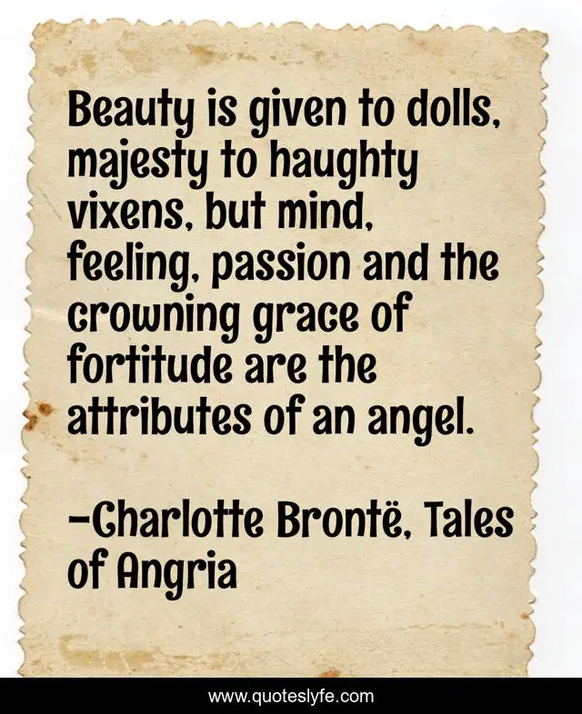 This page presents the quote "Beauty is given to dolls, majesty to haughty vixens, but mind, feeling, passion and the crowning grace of fortitude are the attributes of an angel.". Author of this quote is Charlotte Brontë, Tales of Angria. This quote is about angel, beauty, majesty,.