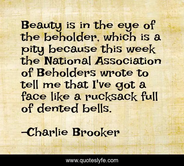 This page presents the quote "Beauty is in the eye of the beholder, which is a pity because this week the National Association of Beholders wrote to tell me that I've got a face like a rucksack full of dented bells.". Author of this quote is Charlie Brooker. This quote is about ugliness, humor, beauty, humour, self-deprecation,.