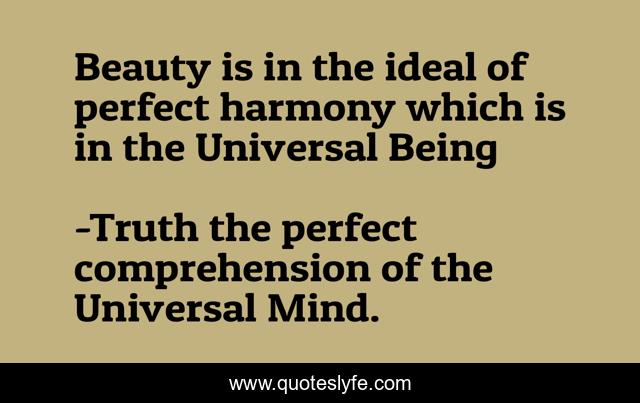 This page presents the quote "Beauty is in the ideal of perfect harmony which is in the Universal Being". Author of this quote is Truth the perfect comprehension of the Universal Mind.. .