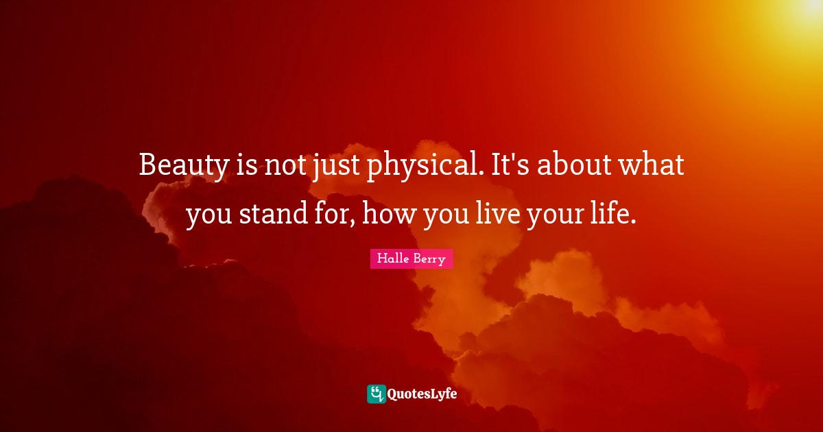 This page presents the quote "Beauty is not just physical. It's about what you stand for, how you live your life.". Author of this quote is Halle Berry. This quote is about beauty, live your life, beauty of life,.