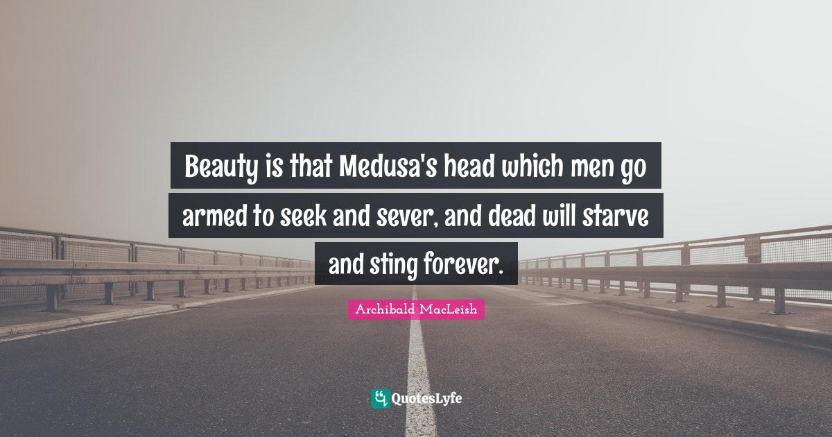 This page presents the quote "Beauty is that Medusa's head which men go armed to seek and sever, and dead will starve and sting forever.". Author of this quote is Archibald MacLeish. This quote is about medusa, beauty, forever, men,.