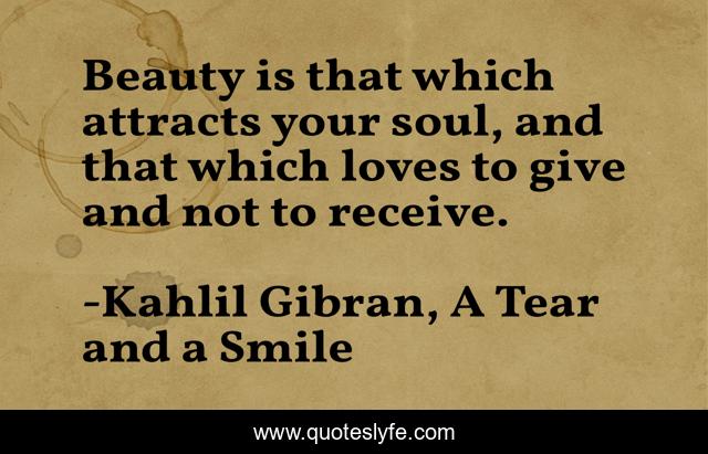 This page presents the quote "Beauty is that which attracts your soul, and that which loves to give and not to receive.". Author of this quote is Kahlil Gibran, A Tear and a Smile. This quote is about giving, receive, receiving, beauty, give,.
