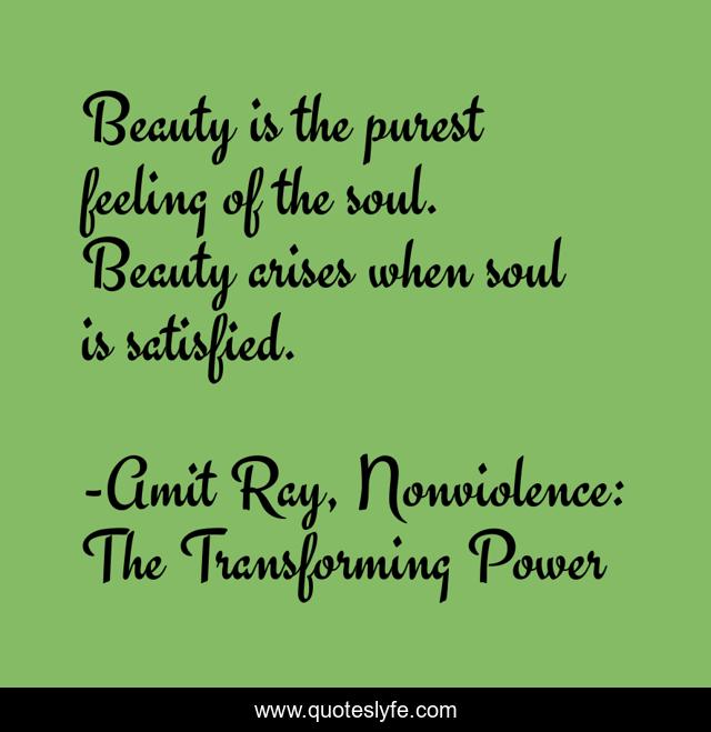 This page presents the quote "Beauty is the purest feeling of the soul. Beauty arises when soul is satisfied.". Author of this quote is Amit Ray, Nonviolence: The Transforming Power. This quote is about beautiful, beauty-in-nature, beauty, purpose-of-life, soulmates, soul, satisfaction, purity, feeling,.