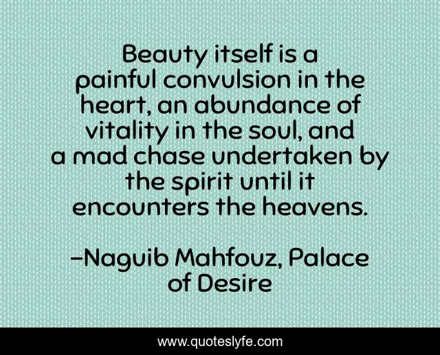 This page presents the quote "Beauty itself is a painful convulsion in the heart, an abundance of vitality in the soul, and a mad chase undertaken by the spirit until it encounters the heavens.". Author of this quote is Naguib Mahfouz, Palace of Desire. .