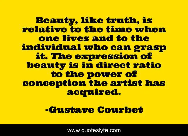This page presents the quote "Beauty, like truth, is relative to the time when one lives and to the individual who can grasp it. The expression of beauty is in direct ratio to the power of conception the artist has acquired.". Author of this quote is Gustave Courbet. This quote is about beauty, truth, time,.
