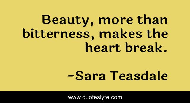 This page presents the quote "Beauty, more than bitterness, makes the heart break.". Author of this quote is Sara Teasdale. This quote is about break, heart, bitterness,.