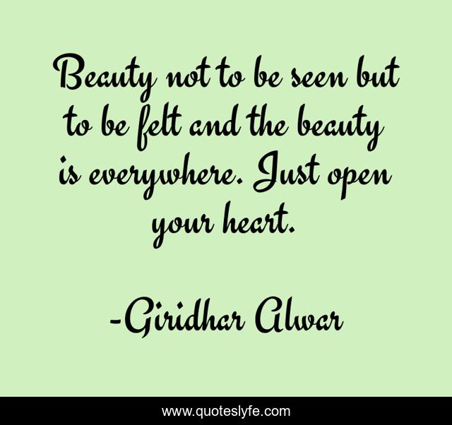 This page presents the quote "Beauty not to be seen but to be felt and the beauty is everywhere. Just open your heart.". Author of this quote is Giridhar Alwar. This quote is about beauty-in-nature, life, beauty,.