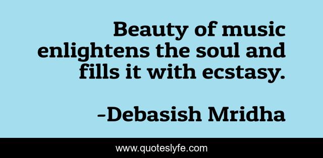 This page presents the quote "Beauty of music enlightens the soul and fills it with ecstasy.". Author of this quote is Debasish Mridha. This quote is about philosophy, beauty, mridha, debasish, debasish-mridha, soul, music, inspirational, enthusiasm,.